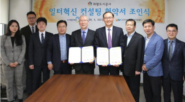 의왕도시공사(사장 최욱)는 고용노동부 산하 노사발전재단에서 지원하는 일터혁신 컨설팅 추진을 위해 수행기관인 미래노사상생지원협회(이사장 백헌기)와 지난 22일 협약식을 체결했다고 밝혔다.