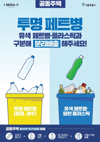 폐페트병·폐비닐 분리배출 요일제는 서울시 25개 전 자치구에서 시행되며 단독주택·상가는 일·화·목요일 배출지역은 목요일에만, 월·수·금요일 배출지역은 금요일에만 투명페트병과 폐비닐을 각각 별도로 배출하고, 그 외의 요일에 기타 재활용품을 배출하는 제도다. 공동주택의 경우 투명 폐페트병 별도 수거함을 설치를 통해 투명 폐페트병을 유색 페트병 및 타 플라스틱과 구분하여 별도 수거함에 배출하면 된다.