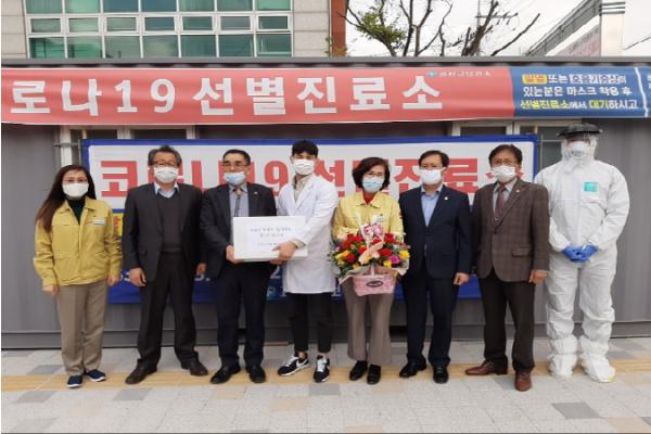 박해운 괴산부군수와 신우식 괴산군사회단체협의회장이 코로나19에 맞서 방역 최 일선에서 사투를 벌이고 있는 의료진들을 격려하기 위해 22일 관내 선별진료소와 보건소를 찾았다.