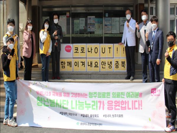 충북도종합자원봉사센터는 23일 청주의료원에서 코로나19에 맞서 묵묵히 고생하는 청주의료원 관계자 100명에게 청년봉사단 나눔누리가 직접 제작한 응원키트를 전달했다.