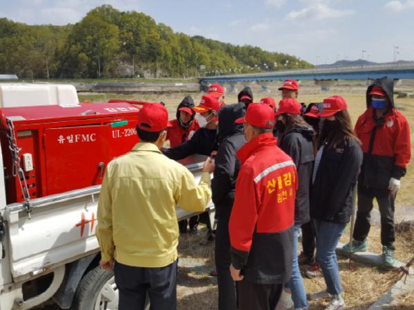 김천시 조마면(면장 위성충)에서는 봄철 대형 산불 특별대책기간에 맞아 4월 23일 오전 관내 강곡리 장암교 둔치에서 직원 및 산불감시원, 마을주민 20여명이 참가한 가운데「산불진화 기계화장비 교육 ·모의 진화훈련」을 실시하였다.