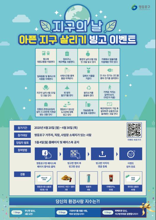 ‘아픈 지구 살리기’ 빙고 이벤트는 구민 또는 영등포구에 직장(사업장)이 소재한 사람이라면 누구든지 참여 가능하다.