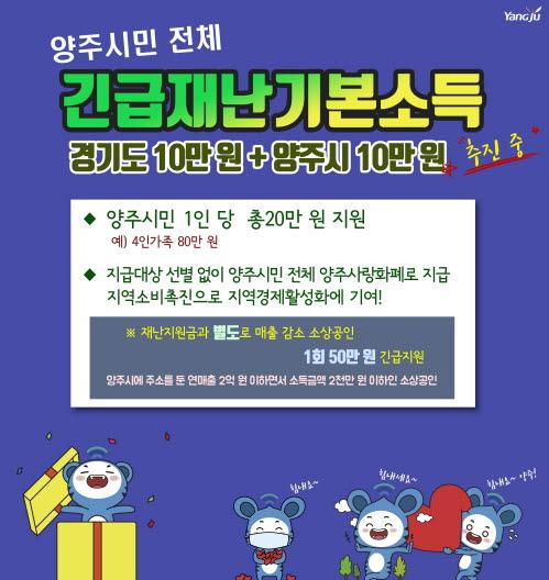 시는 코로나19로 위축된 경제위기를 극복하고자 경기도민 1인당 10만원의 경기도 재난기본소득에 더해 양주시민 1인당 10만원의 재난기본소득 지급을 추진중에 있다.