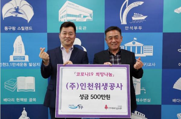 인천 동구(구청장 허인환)는 30일 접견실에서 인천위생공사(대표이사 김문산) 측에서 기탁한 코로나19 특별 성금(500만 원) 전달식을 가졌다.