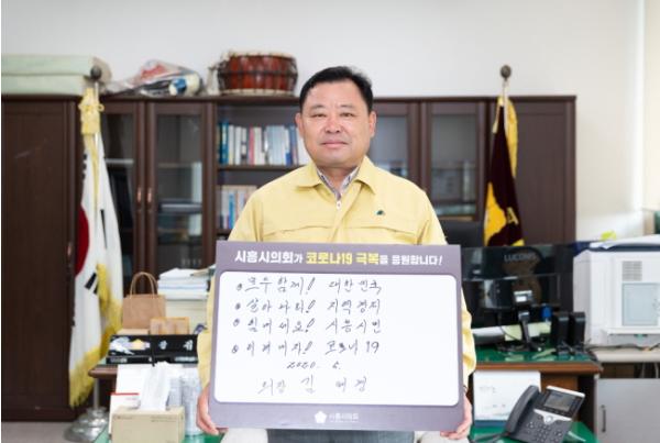 성공회대학교 김기석 총장의 추천으로 이번 캠페인에 동참하게 된 김 의장은 ‘모두함께 대한민국, 살아나라 지역경제, 힘내세요 시흥시민, 이겨내자 코로나19’라는 손글씨 응원 문구를 페이스북에 게재했다.