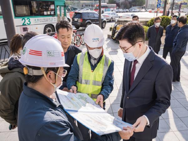 이정훈 강동구청장이 지난 24일(금) 오후 5시 천호지하차도 평면화 및 중앙버스전용차로 설치 공사 현장을 방문 점검했다.