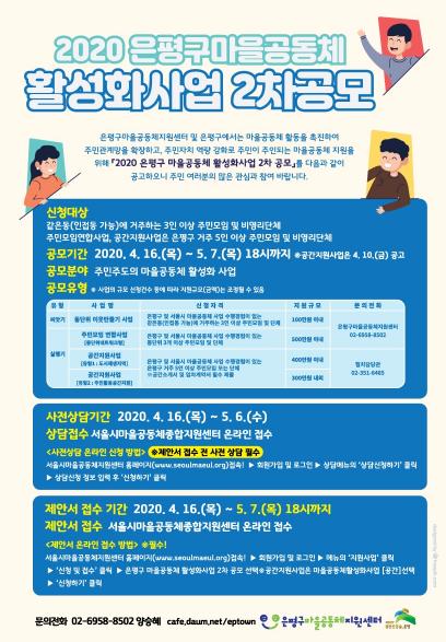 온라인설명회에서는 은평구마을공동체지원센터(센터장 이춘희)를 통해 2020년 은평구 마을공동체활성화 공모사업의 분야별.단계별 사업 소개, 사업수행 방법, 보조금 집행기준과 사업제안서 작성법 등이 소개된다.