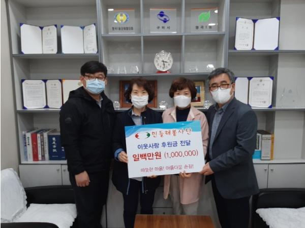 형곡1동(동장 박경자)에서는 4. 24.(금) 민들레봉사단(단장 김정해)에서 코로나19 확산으로 인해 어려움을 겪고 있는 관내 취약 가구를 위해 후원금 100만원을 기탁했다.