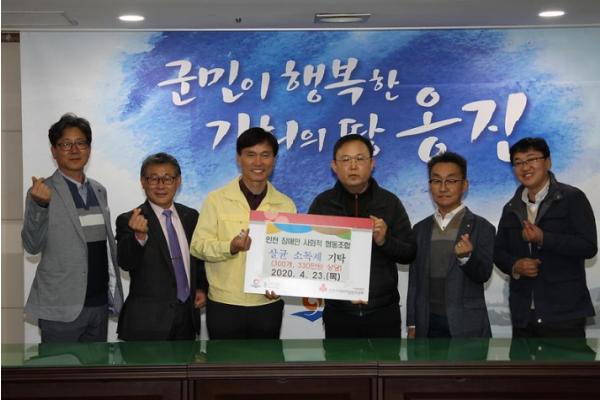 인천시 옹진군(군수 장정민)은 지난23일 옹진군청 2층 소회의실에서 인천장애인사회적협동조합(조합장 최선근)으로 부터 코로나19 지역사회 감염병 예방을 위한 살균 소독제 300개를 기부 받았다고 27일 밝혔다.