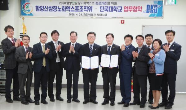 함양산삼항노화엑스포조직위원회(위원장 김경수 경상남도지사)는 지난 24일 함양박물관 세미나실에서 단국대학교(총장 김수복)와 엑스포 성공개최를 위한 업무협약식을 가졌다고 밝혔다.