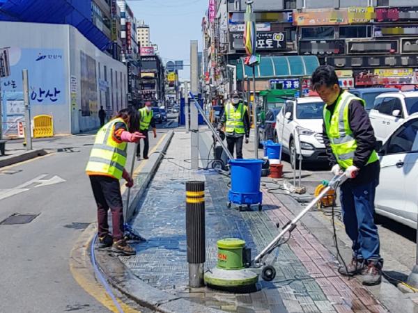 지난 21일부터 나흘간 진행된 청소는 고압세척기와 바닥광택기를 이용해 쓰레기 배출장소와 보행로 1㎞ 구간에 대한 물세척 청소 등으로 진행됐다. 주변 상가에서는 청소에 필요한 물을 제공하며 원활한 작업에 적극 협력했다.