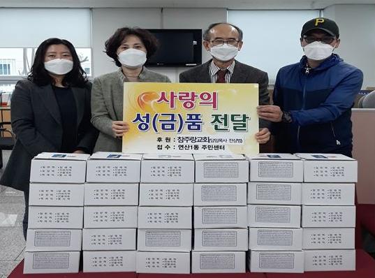 연제구 연산1동(동장 박순미)은 지난 1일 참주랑교회(담임목사 전상범)로부터 취약계층의 코로나19 극복을 위한 가래떡 30박스(45만 원 상당)를 기탁받아 저소득 가정 30세대에 전달했다.