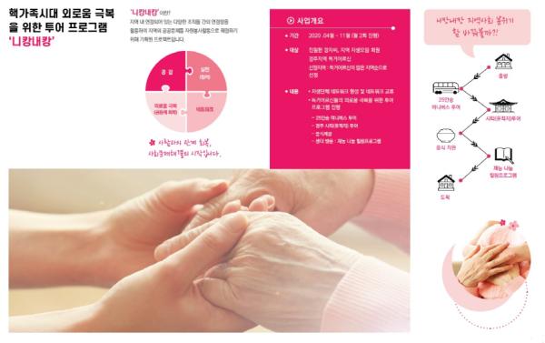 ‘니캉내캉’의 세부일정은 코로나19 사태가 끝나는 시점부터 11월까지 월 2회씩(주중, 주말) 진행될 계획이며 지역 자생단체 회원들과 독거어르신이 1:1로 매칭 되는 일일투어 프로그램으로 25인승 미니버스를 활용해 말벗뿐만 아니라 시티투어, 중식 지원, 재능 나눔 힐링 프로그램을 진행하게 된다.