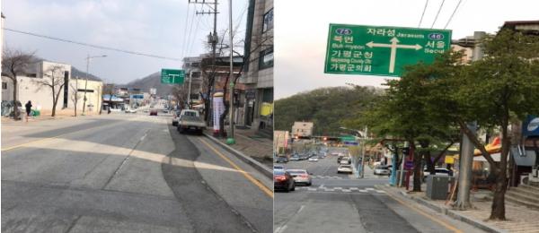 가평 공설운동장 입구에 설치된 이정표지판은 두 곳이 있는데 가평 공설운동장 삼거리에서 내려와 좌측으로는 가평군청, 우측으로는 서울방향, 정면으로는 가평천 제방까지 연결되는 이정표지판이 사거리인데 삼거리로 되어 있고 또 한 곳은 공설운동장으로 진입하는 곳으로 이곳 역시 당초 1993년도에 개설 당시에는 직진형으로 편도 2차선으로 준공되었으나 2014년도에 도시 외곽도로(선힐 APT~한석봉 체육관 방면)가 개통되면서 현재에 이르기까지 이정표지판이 삼거리인데 사거리로 되어 있다.