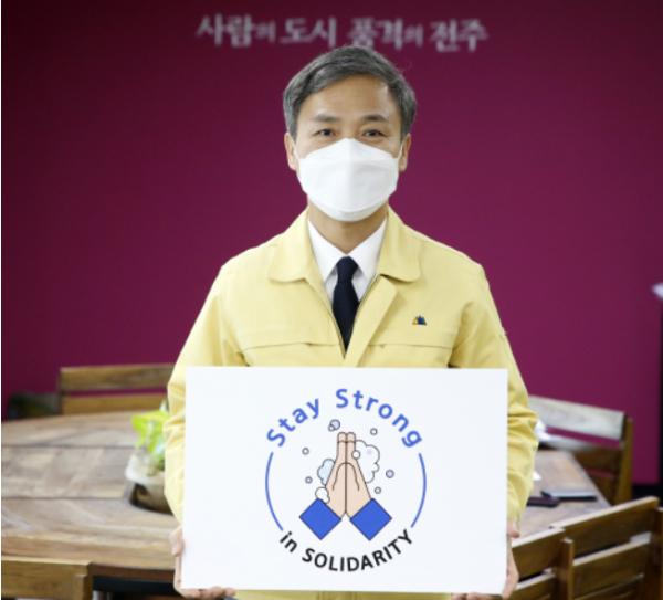 김승수 전주시장이 코로나19로 인해 지치지 말고 굳은 연대로 굳건히 이겨내자는 SNS(쇼셜네트워크) 릴레이 캠페인에 동참했다.