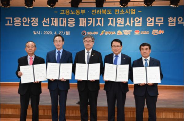 28일 완주군은 지난 27일 전북테크노파크에서 고용노동부 장관, 전라북도지사, 익산시장, 김제시장 등 사업 수행기관의 장 등 30여명이 참석한 가운데 ‘고용안정 선제대응 패키지사업’ 업무협약식을 체결했다.