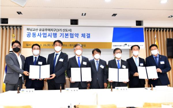 이재명 경기도지사와 변창흠 LH 사장, 이헌욱 경기도시공사 사장, 김경수 하남도시공사 사장은 28일 경기도청 상황실에서 하남교산 공공주택지구 공동사업시행을 위한 기본협약을 체결했다. 이 자리에는 김상호 하남시장, 최종윤 국회의원 당선인 등도 참석했다.