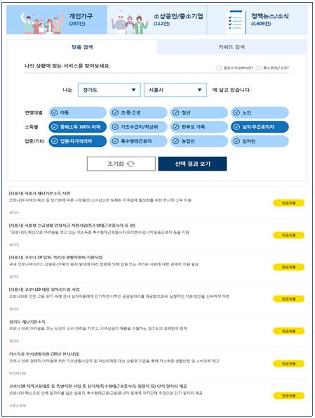 소상공인 및 중소기업의 경우 사업장의 매출액, 신용도, 피해업종 여부 등 검색조건에 따라 다양한 서비스를 확인할 수 있다.