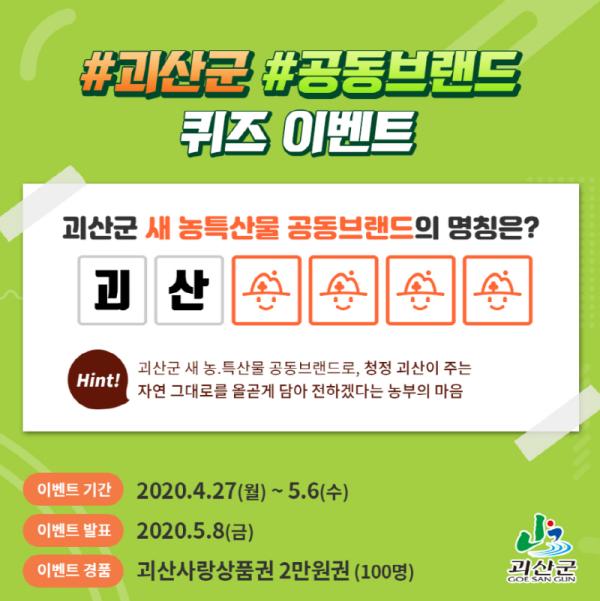 군 관계자는 “SNS 퀴즈 이벤트를 통해 올해 새롭게 탄생한 괴산의 농·특산물 공동브랜드를 적극 홍보할 것”이라며, “이벤트에 많은 분들의 관심과 참여를 바란다”고 말했다.