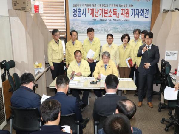 유진섭 시장과 최낙삼 정읍시의회 의장은 28일 정읍시청 브리핑실에서 기자회견을 열고 정읍시 재난기본소득 지급계획을 발표했다.