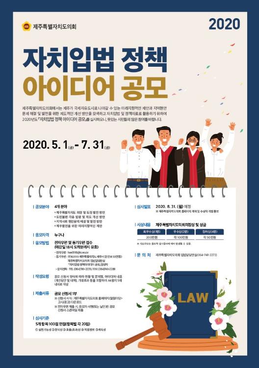 제주특별자치도의회(의장 김태석)는 시민들의 창의적인 아이디어를 정책개선에 활용하기 위해 오는 5월 1일부터 7월까지 3개월동안 ?년 자치입법 정책 아이디어 공모’를 실시한다고 밝혔다.