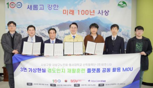 부산 사상구(구청장 김대근)는 지난 28일 대한노인회 사상구지회(지회장 김덕수), 동서대학교 산학협력단(단장 정도운) 및 ㈜유캔스타(대표 최대길)와 어르신 인지능력 향상을 위한 경도인지 재활 플랫폼 업무 협약식을 체결하였다.
