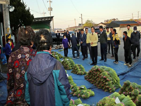 이날 군수는 도덕면에 소재한 녹동농협 도덕지점과 가룡지점 등 2개소에서 실시되는 마늘종 수매현장을 방문, 마늘종 거래 현황과 이상 기온으로 인한 작황 부진 등 농가의 애로사항을 청취하고 년 1,500톤(50억) 이상 수확되어 전국으로 유통되고 있는 마늘쫑이 농가소득 증대에 조금이나마 도움이 되고 있어 마늘종 수매장 관계자의 노고에 감사를 드렸다.