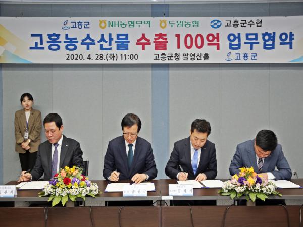 고흥군은 28일 군청 팔영산홀에서 송귀근 군수, 김재기 NH농협무역 대표이사, 두원농협 신선식 조합장, 고흥군수협 이홍재 조합장, NH농협 고흥군지부 임성재 지부장 등 각 기관 관계자 등 20여명이 참석한 가운데 고흥의 안전하고 우수한 품질의 농수산물 수출 확대를 위한 업무협약을 체결했다고 밝혔다.