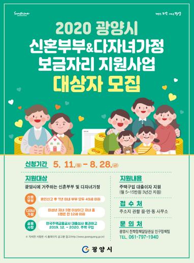 광양시가 신혼부부와 다자녀가정의 주거비 부담을 덜어주기 위해 주택구입 대출이자 일부를 지원하는 ‘신혼부부·다자녀가정 보금자리 지원사업’을 전라남도와 함께 시행한다고 29일 밝혔다.