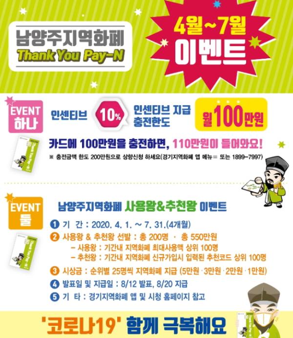 조광한 남양주시장은 “지역화폐 확대발행 및 사용촉진 이벤트를 통해 코로나19로 침체된 골목상권 및 지역경제 활성화를 위해 지역 내 소비를 촉진하고, 소상공인과 영세업자에게 활력을 불어넣는 계기가 되었으면 한다.”며 “앞으로도 더욱 다양한 정책을 발굴하는데 주력하겠다.”고 말했다.