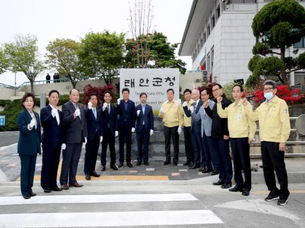 군은 지난 1일 군청 정문에서 가세로 군수와 군의원 등이 모인 가운데 ‘태안군청 표지 제막식’을 간소하게 실시하고, 앞으로 군민의 행복을 최우선으로 ‘다함께 더불어 더 잘사는 새태안’ 건설에 최선을 다할 것을 다짐했다.