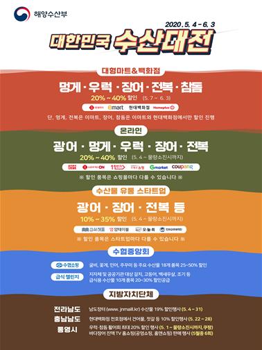 해양수산부(장관 문성혁)는 코로나19로 인해 위축된 수산물 소비를 활성화하고, 경영에 어려움을 겪고 있는 어업인들을 지원하기 위해 5월 4일(월)부터 6월 3일(수)까지 한 달간 ‘대한민국 수산대전’ 행사를 진행한다.