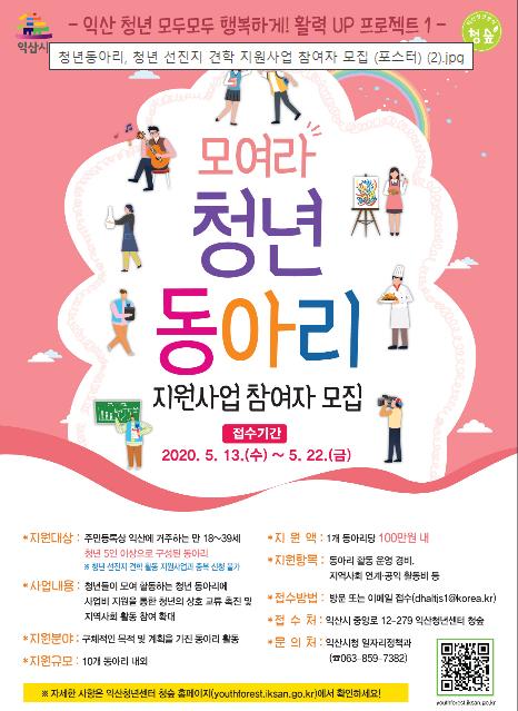 사업대상은 익산에 거주하는 만 18~39세 청년 5인 이상으로 구성된 동아리로, 10개 동아리를 선정하여 동아리당 최대 100만원의 활동비를 지원한다. 활동비는 동아리 활동에 필요한 강사료, 교재비 및 재료 구입비, 공익 활동비, 모임비 등으로 사용할 수 있다.