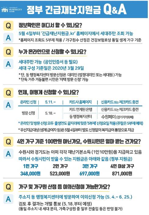 정부가 발표한 긴급재난지원금 액수는 1인 가구 40만 원·2인 가구 60만 원·3인 가구 80만 원, 4인 이상 가구는 100만 원이다. 정부 발표 금액과 수원시민 지급 금액이 다른 이유는 국비·지방비 부담 비율 때문이다.