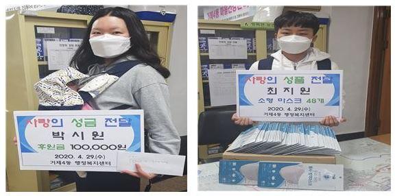 또 최지원 학생은 “취약계층 아동들의 코로나19 감염 예방에 도움이 되었으면 좋겠다”며 본인이 구매한 일회용 마스크(소형) 48개를 기탁해 뜻깊은 이웃사랑을 실천했다.