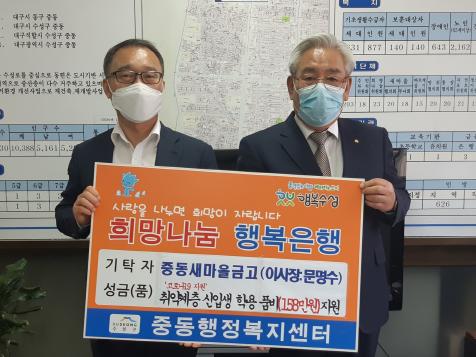 대구 수성구 중동새마을금고(이사장 문명수)는 최근 어려운 이웃을 위해 사랑의 좀도리 운동으로 마련한 성금 158만원을 중동행정복지센터에 기탁했다.