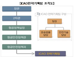 ICAO전략기획팀은 항공안전정책관 내 총 5명으로 구성되며, 기존 국토교통부 항공정책실 각 과에서 개별 담당한 국제협력업무를 이관 받아 국제항공분야의 정책·기준·대외 협력 및 원조 등에 관한 종합전략을 수립·추진하는 컨트롤 타워 역할을 수행한다.