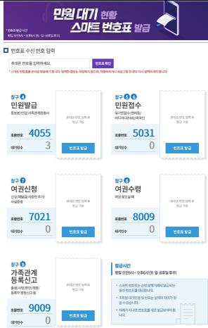 민원 대기시간 단축과 코로나19 이후 부각된 ‘사회적 거리두기’ 실천 차원에서 도입된 ‘스마트 민원발권 시스템’도 주목을 끈다. ▲등·초본, 인감, 가족관계증명서 등 민원 발급 ▲유기한 접수, 면허증, 어디서나(FAX), 외국인 등 민원 접수 ▲여권 관련 업무 ▲여권 수령 ▲출생, 사망, 혼인, 개명, 등록부 정정신고 등 가족관계등록신고 관련 업무를 PC나 스마트폰으로 신청하면 스마트번호표가 휴대폰 문자나 카카오톡으로 전송된다.