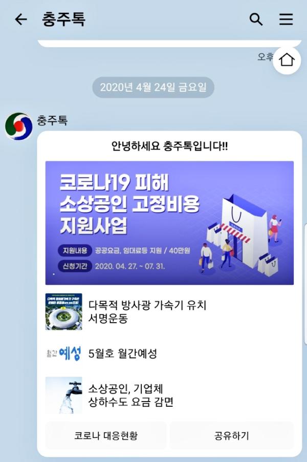 시에 따르면 충주시 코로나19 첫 확진자 발생 이전 (2019.7.1.~2020.2.14) 기간에 충주톡 메시지에 대한 클릭율은 평균 49.79%였으나 충주시 1번 확진자 발생 이후의 메시지 클릭율은 82.8%로 66% 대폭 증가했다.