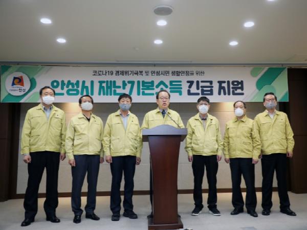 안성시는 3월 31일, 안성시청 2층 상황실에서 안성시 재난기본소득 긴급 지급 관련 브리핑을 갖고, 3월 30일 기준으로 안성시에 주소지를 두고 있는 모든 시민에게 1인당 재난기본소득 25만원을 지원한다고 밝혔다.