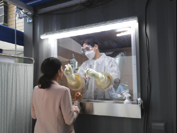 ‘워킹 스루’ 검사는 환자-의료진의 비대면 진료 방식으로, 선별진료소 내부에 있는 의료진이 창문에 붙어있는 장갑을 착용하고 바깥에 대기 중인 환자의 검체를 채취하는 방식으로 이뤄진다.