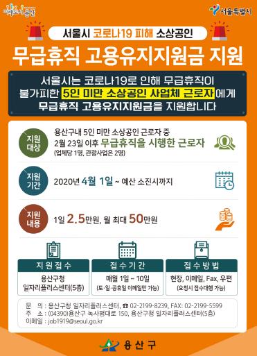 서울 용산구(구청장 성장현)가 이달부터 소상공인 무급휴직자를 대상으로 고용유지지원금을 지급한다.