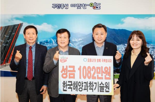 한국해양과학기술원(원장 김웅서)는 4월 28일 코로나19 위기해소를 위해 직원들의 마음이 모인 성금 1,082만원을 영도구에 전달했다.