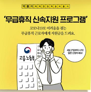 무급휴직 신속지원으로 당장 생계 어려움을 겪는 근로자를 돕고 대규모 고용안정 패키지를 통해 코로나19로 인한 고용충격도 함께 줄여가겠습니다!