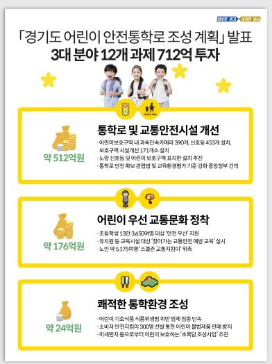 이에 도는 올해 ‘어린이 등하굣길이 안전한 경기도 실현’을 목표로, ‘통학로 안전시설 대폭 개선’, ‘교통안전 의식 개선’, ‘학교 주변 유해요소 제거’등 3대 분야 12개 과제를 추진한다. 사업비는 각각 512억 원, 176억 원, 24억 원씩 총 712억 원이 투자될 예정이다.