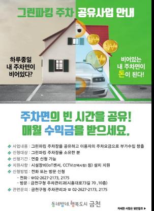 유성훈 금천구청장은 “그린파킹과 주차공유사업을 통해 주택가 주차난 해소뿐 아니라 주차장 소유주는 주차장이 빈 시간을 활용해 수입을 얻고, 사용자는 저렴하고 편리하게 주차장을 이용할 수 있는 일석삼조의 효과를 거둘 수 있을 것으로 기대하고 있다”고 말했다.