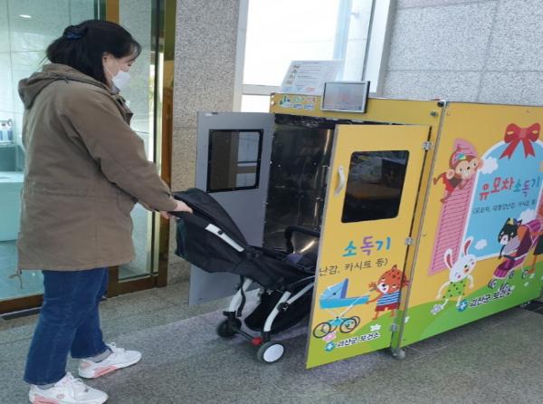 충북 괴산군 보건소(소장 김금희)가 코로나19 예방과 확산 방지를 위해 보건소 1층 로비에 ‘유모차 소독기’를 설치·운영하고 있다고 6일 밝혔다.