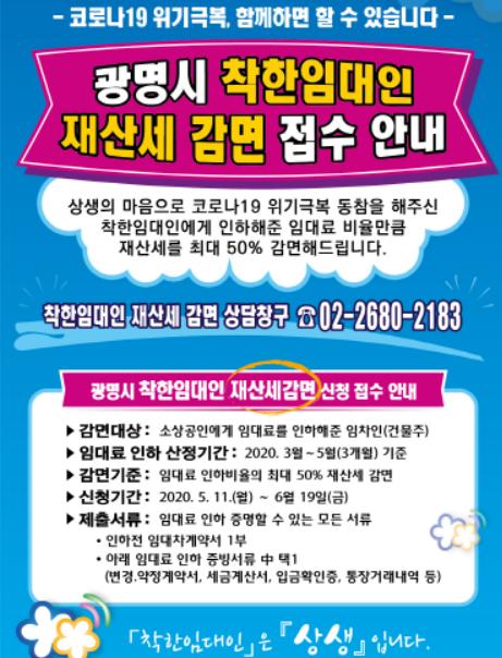 광명시는 코로나19로 어려움을 겪는 소상공인에게 임대료를 인하해 준 건물주를 대상으로 오는 11일부터 6월 19일까지 재산세 감면 신청을 받는다고 7일 밝혔다.