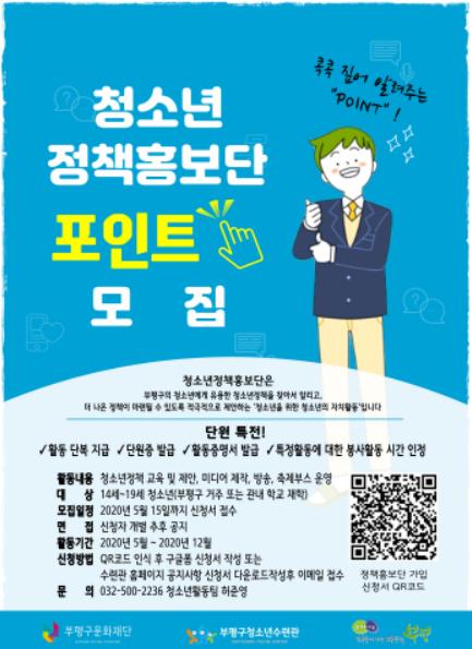 청소년정책홍보단 ‘포인트’는 부평구 청소년들이 모여 정책을 제안했던 2019년 부평청소년참여예산학교에서 제안된 활동이다.