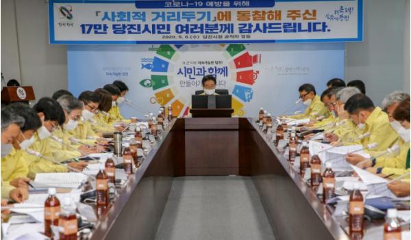 지난 6일 사회적 거리두기 기간 동안 진행하지 못했던 당진시 간부공직자 회의가 당진시청 소회의실에서 열렸다. 회의에서 당진시 공직자 일동은 3월 22일부터 5월 5일까지 45일동안 사회적 거리두기에 적극 동참해주신 17만 당진시민께 감사의 말씀을 전했다.